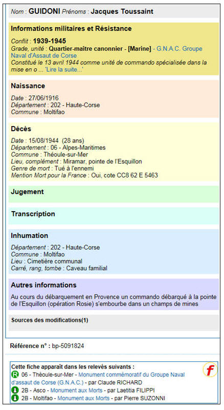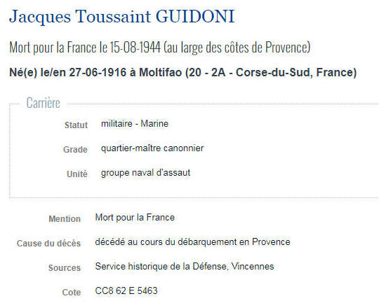 MOLTIFAO (Corse du Sud) - Décédé le 15 août 1944 au Cap de l'Esquillon,