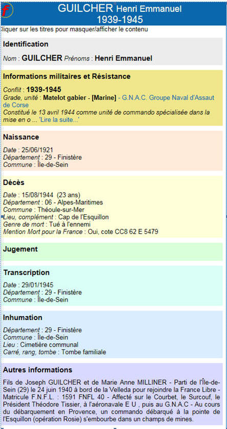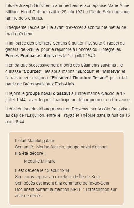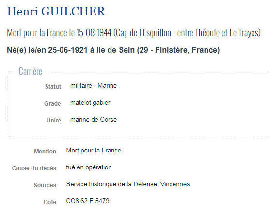 l'ÎLE de SEIN (Finistère) - Décédé le 15 août 1944 au Cap de l'Esquillon,