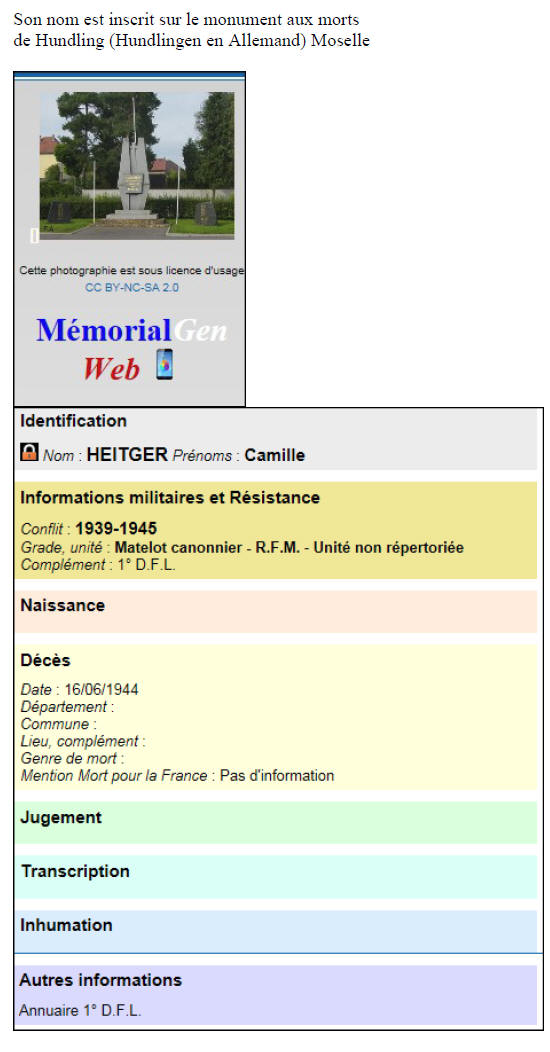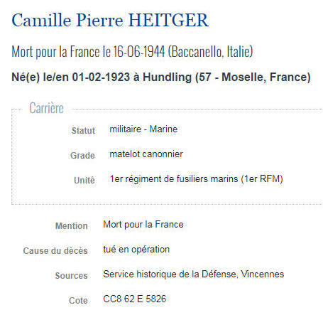 Né le 1er février 1923 à HUNDLING (Moselle) - Décédé le 16 juin 1944