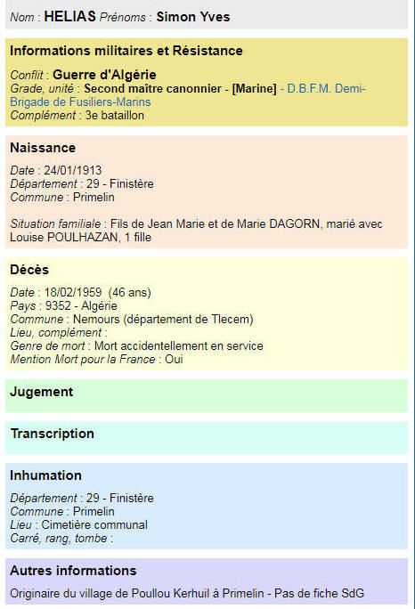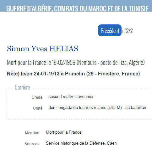 PRIMELIN (Finistère) - Décédé le 18 février 1959 à NEMOURS, poste de