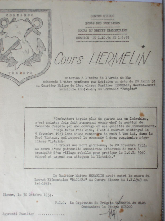 au Q/M1 fusilier HERMELIN Gérard André, Mle: 1884 L 48 du commando