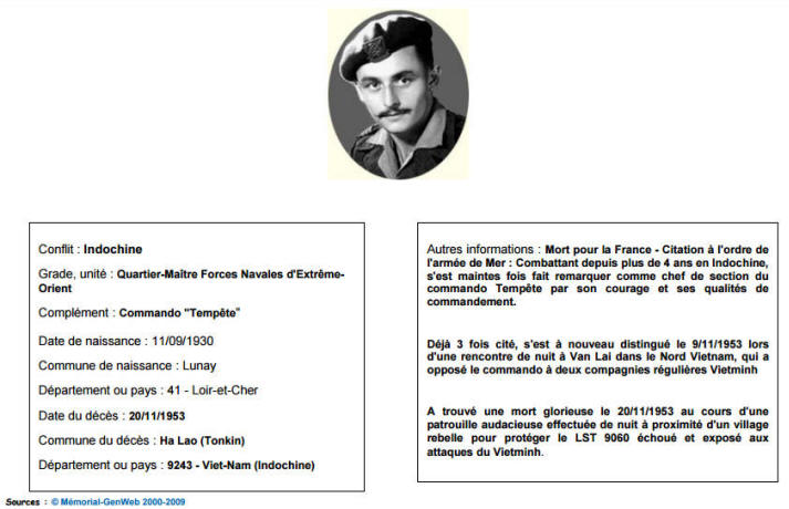 Né le 11 septembre 1930 à LUNAY (Loir et Cher) - Tué en Indochine, a