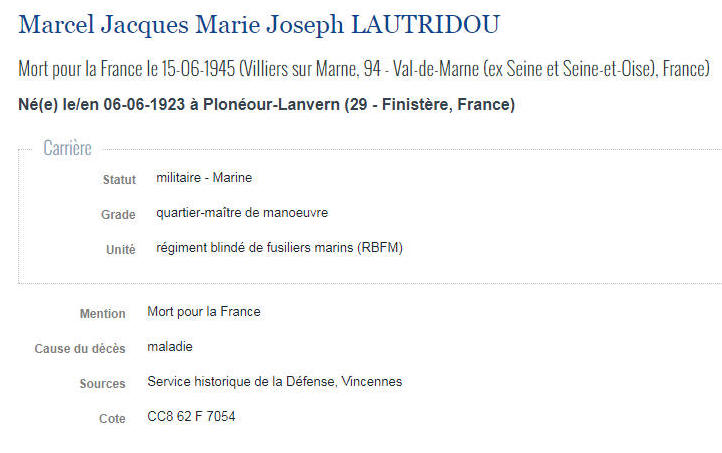 PLONEOUR-LANVERN (Finistère) - Décédé le 15 juin 1945 à VILLIERS sur