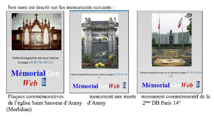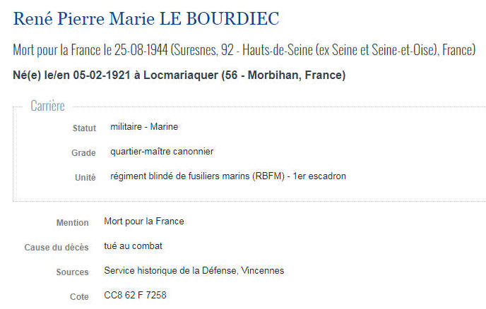 LOCMARIAQUER (Morbihan) - Décédé le 25 août 1944 à SURESNES (Hauts