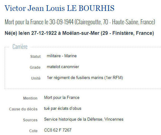 Né le 27 décembre 1922 à MOËLAN sur MER (Finistère) - Décédé le 30