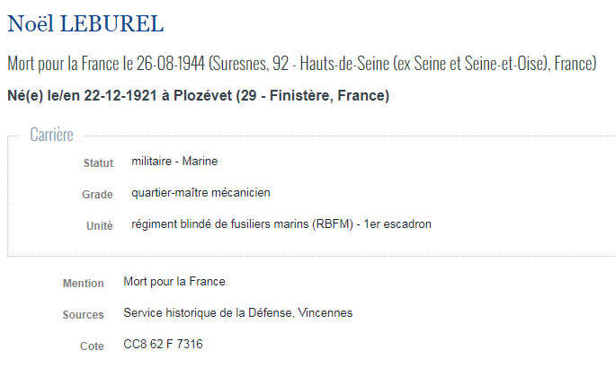 à PLOZEVET (Finistère) - Décédé le 26 août 1944 à SURESNES (Hauts de