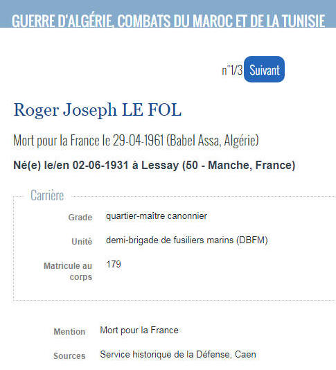 Né le 2 juin 1931 à LESSAY (Manche) - Décédé le 29 avril 1961 à BABEL ASSA (Algérie)