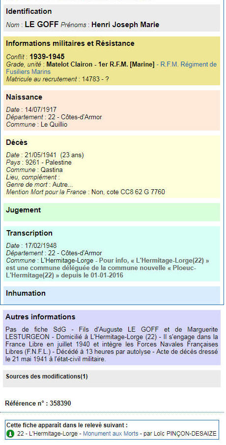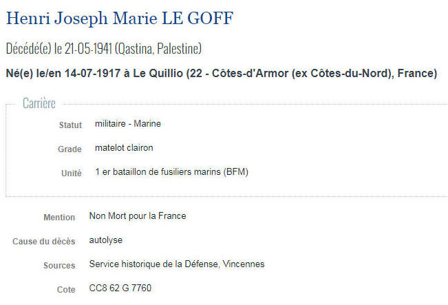 Né le 14 juillet 1917 à LE QUILLIO (Côtes d'Armor) - Décédé le 21