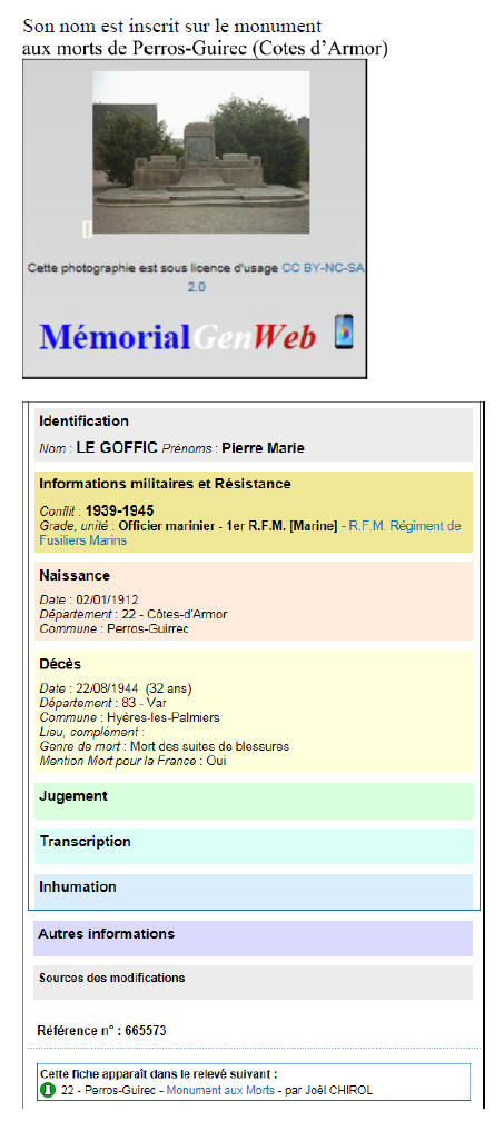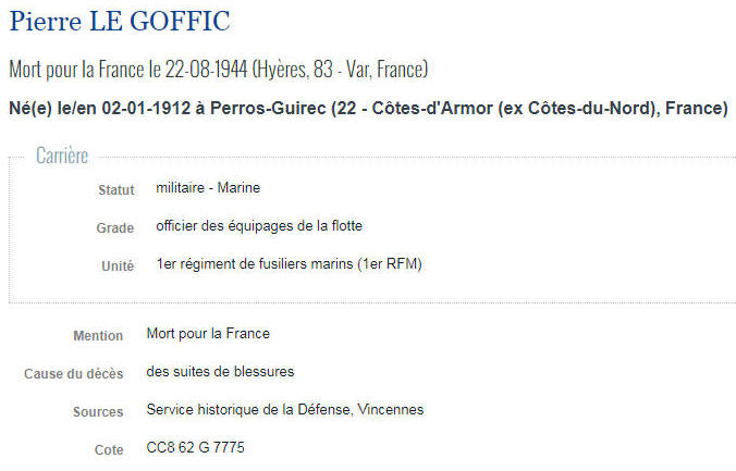 Né le 2 janvier 1912 à PERROS GUIREC (Côtes d'Armor" - Décédé le 22