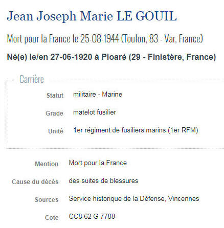 Né le 27 juin 1920 à PLOARE (Finistère) (Aujourd'hui, Douarnenez) - Décédé le 25 août 1944 à