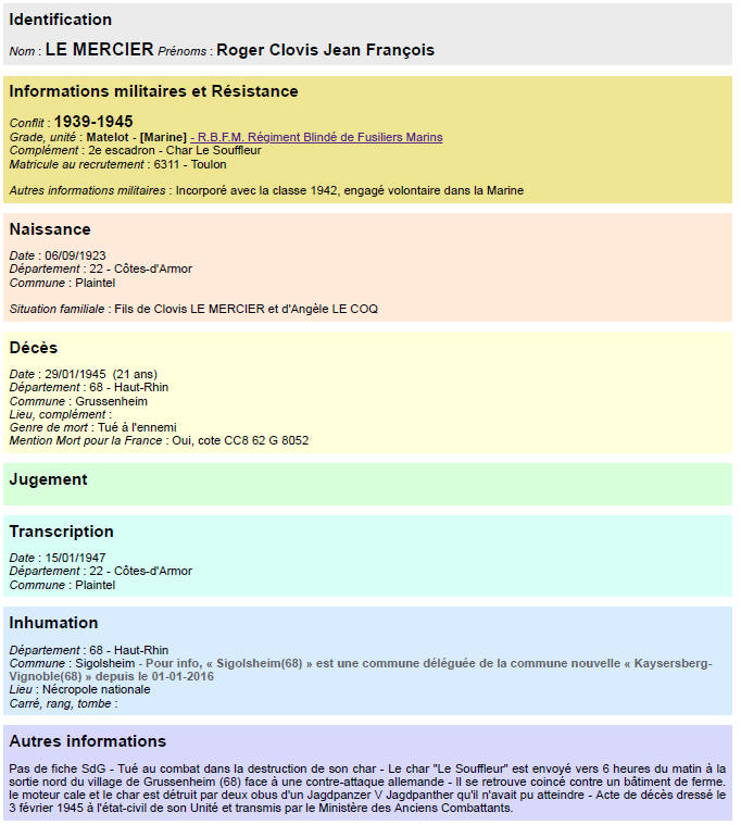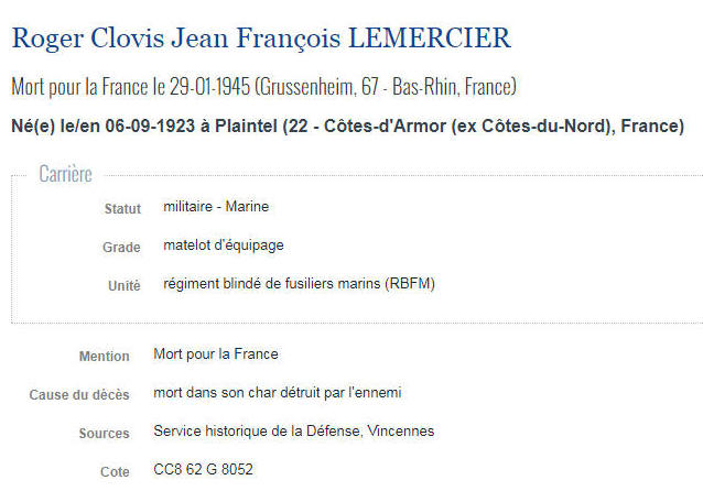 à PLAINTEL (Côtes d'Armor) - Décédé le 29 janvier 1945 à GRUSSENHEIM