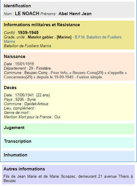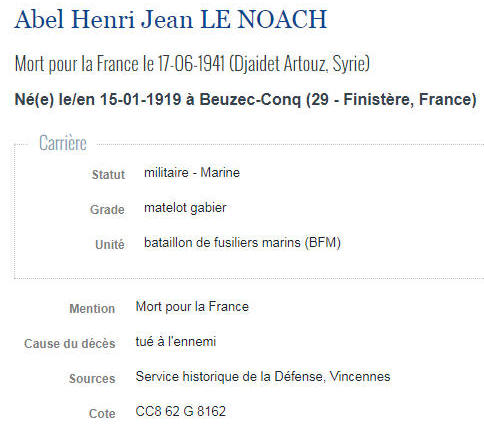 Né le 15 janvier 1919 à BEUZEC CONQ (Finistère) - Décédé le 17 juin