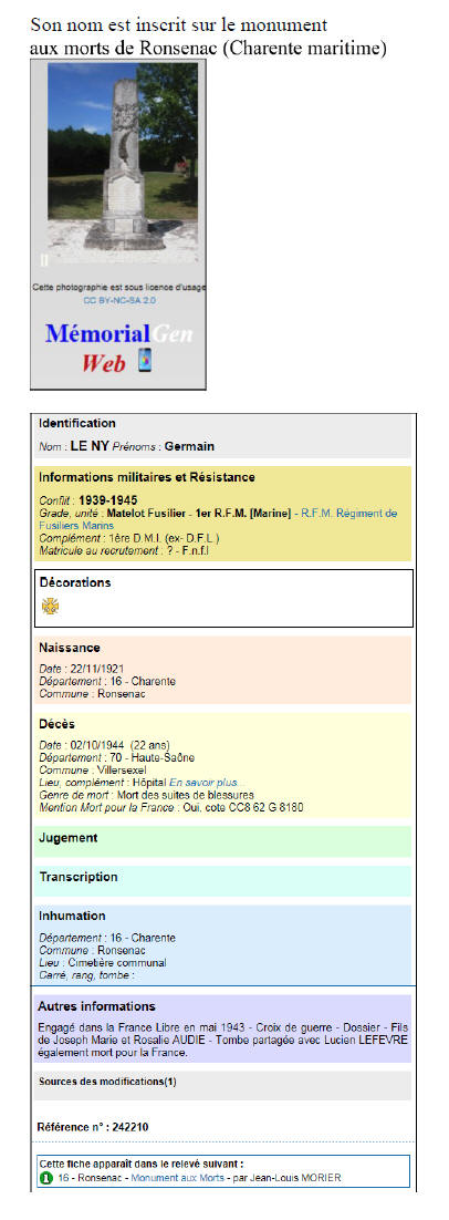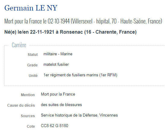 Né le 22 novembre 1921 à RONSENAC (Charente) - Décédé le 2 octobre