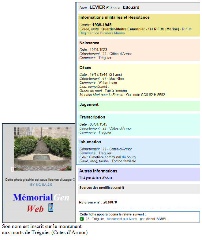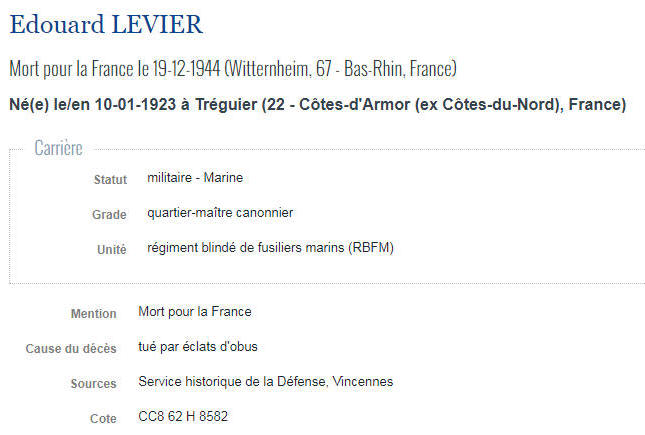 TREGUIER (Côtes d'Armor) - Décédé le 19 décembre 1944 à WITTERNHEIM