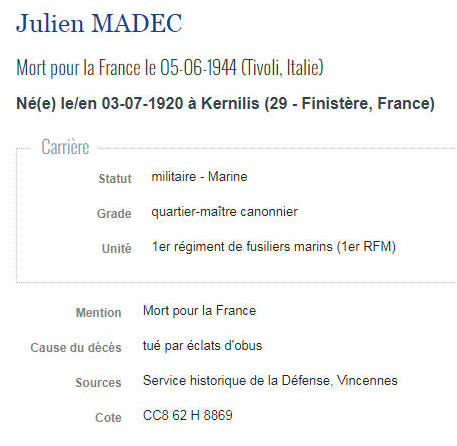 Né le 3 juillet 1920 à KERNILIS (Finistère) - Décédé le 5 juin 1944