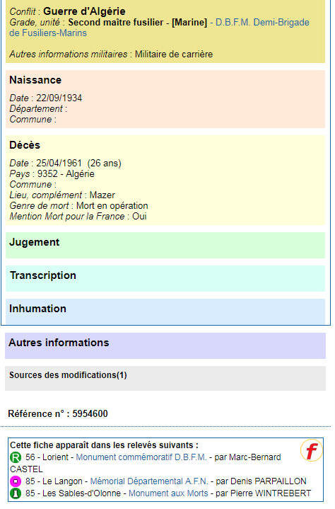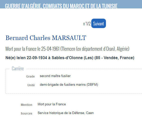 à LES SABLES d'OLONNE (Vendée) - Décédé le 25 avril 1961 à TLEMCEN (Algérie)
