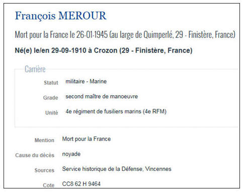 à CROZON (Finistère) - Décédé par noyade le 26 janvier 1945 au large