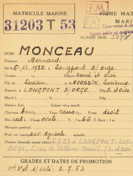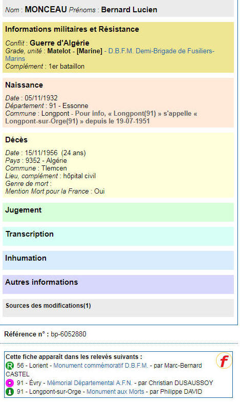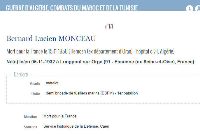 LONGPONT sur ORGE (Essonne) - Décédé le 15 novembre 1956 à TLEMCEN,