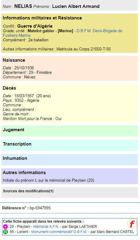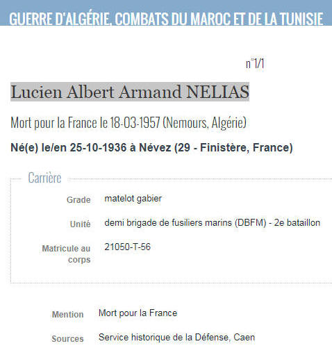 NEVEZ (Finistère) - Décédé le 18 mars 1957 à NEMOURS (Algérie)