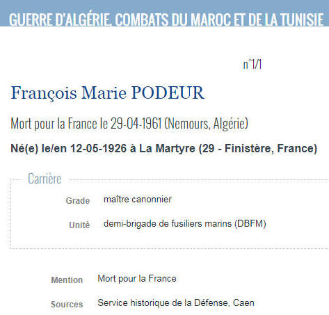 MARTYRE (Finistère) - Décédé le 29 avril 1961 à NEMOURS (Algérie)