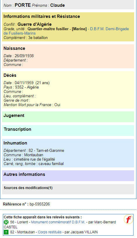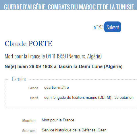 Né le 26 septembre 1938 à TASSIN la DEMI-LUNE (Algérie) - Décédé le 4 novembre 1959 à NEMOURS (Algérie)