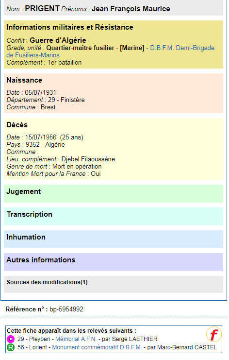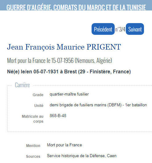 BREST (Finistère) - Décédé le 15 juillet 1956 à NEMOURS (Algérie)
