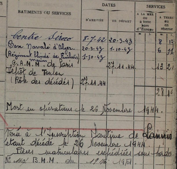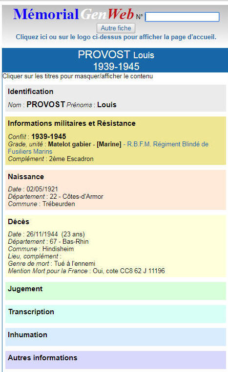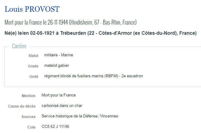 TREBEURDEN (Côtes d'Armor) - Décédé le 26 novembre 1944 à HINDISHEIM
