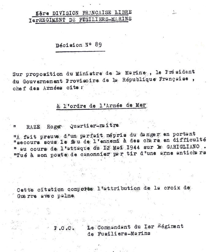 l'armée de mer à titre posthume, décision n° 89 du 11 octobre 1944