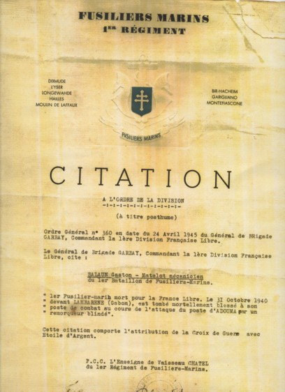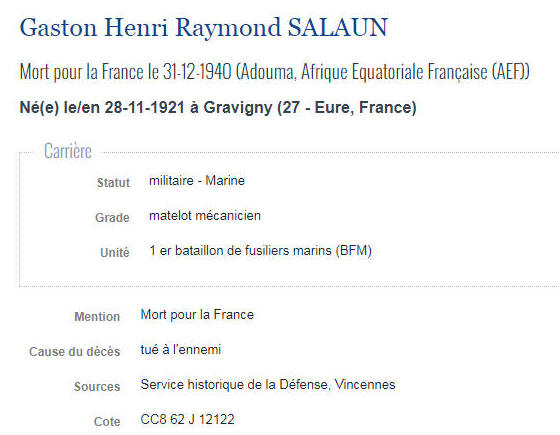 de combat devant LAMBARENE (Gabon) au cours de l'attaque du poste d'ADOUMA
