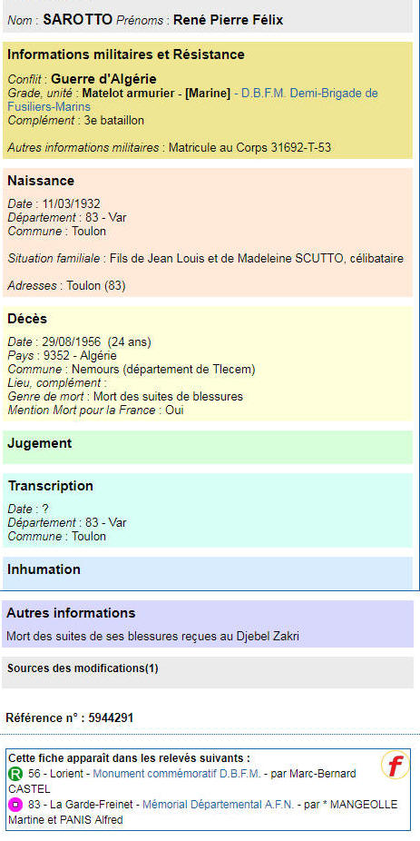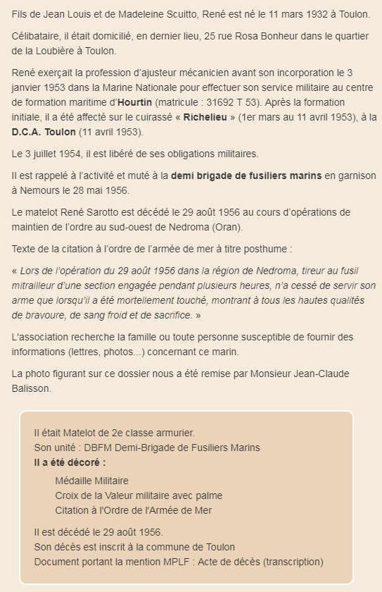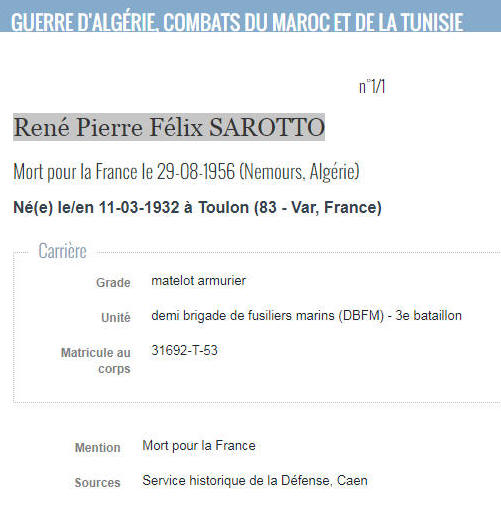 Né le 11 mars 1932 à TOULON (Var) - Décédé le 29 août 1956 à NEMOURS (Algérie)