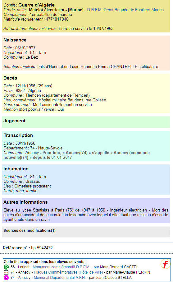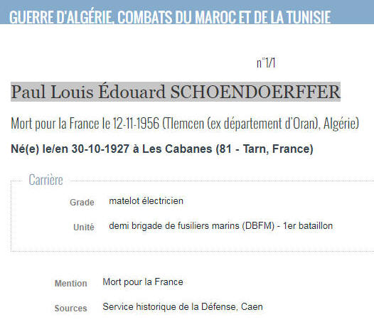 Né le 30 octobre 1927 à LES CABANES (Tarn) - Décédé le 12 novembre 1956 à TLEMCEN (Algérie)