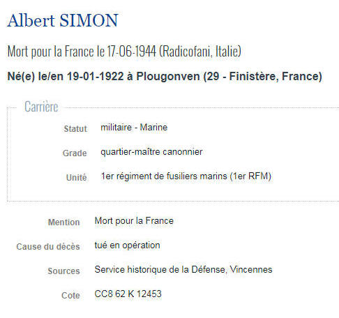 Né le 19 janvier 1922 à PLOUGONVEN (Finistère) - Décédé le 17 juin
