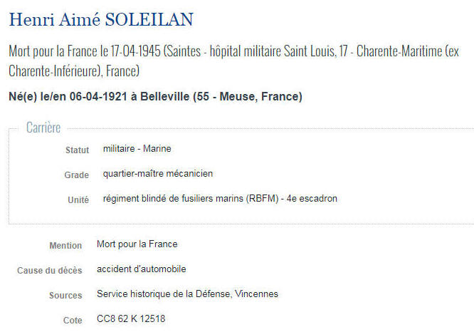 Mention sur le monument aux Morts de Belleville sur Meuse