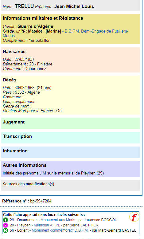 Mentionné au monument aux morts de Douarnenez
