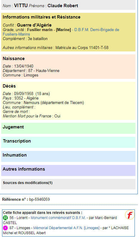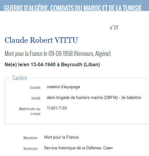 BEYROUTH (Liban) - Décédé le 9 septembre 1958 à NEMOURS (Algérie)