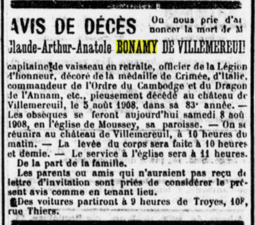 Décédé le 5 août 1908 au château de VILLEMEREUIL (Aube).
