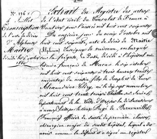 - Décédé le 6 octobre 1860 à MACAO (Chîne aujourd'hui)