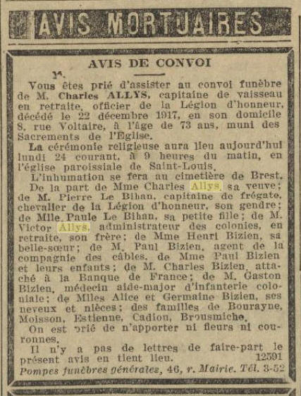 (Morbihan) - Décédé le 22 décembre 1917 à BREST (Finistère)