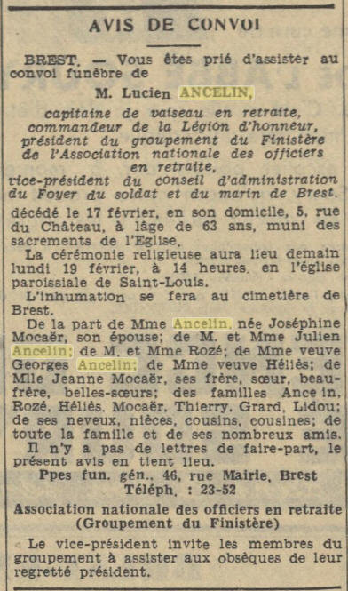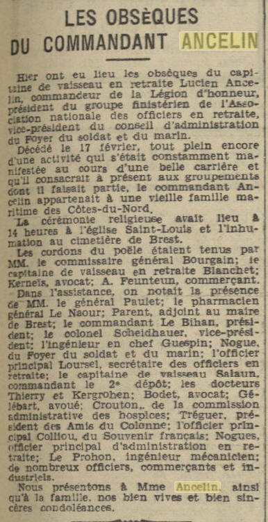 (Ille-et-Vilaine) - Décédé le 17 février 1940 à BREST (Finistère)
