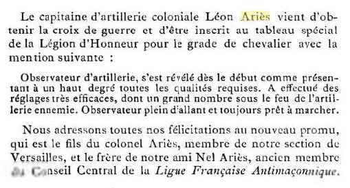 d'artillerie coloniale Léon Ariès vient d'obtenir la croix de guerre