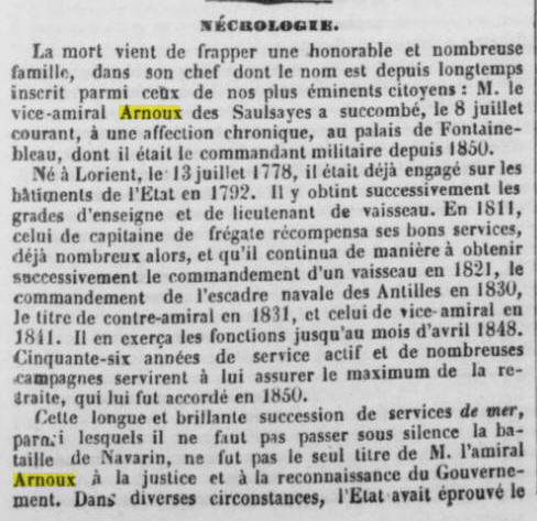 (Morbihan) - Décédé le 8 juillet 1852 au château de FONTAINEBLEAU