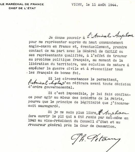 Il fut chargé en août 1944 par le maréchal Pétain d'une démarche