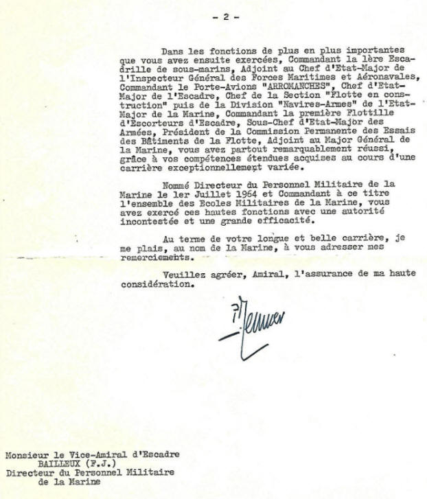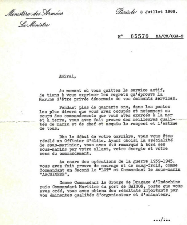 Lettre du Ministre des Armées Pierre Messmer adressée le 8 juillet