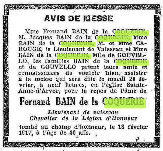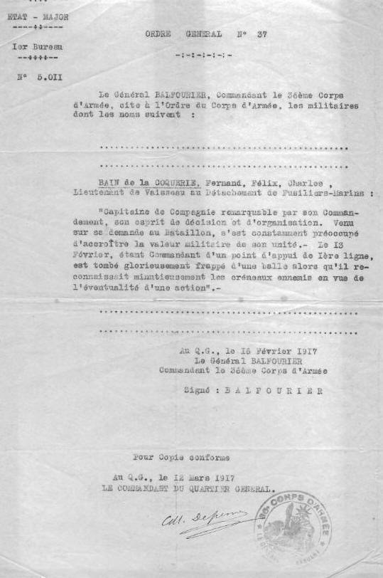 au Bataillon de Fusiliers Marins, est tué le 13 février 1917, à