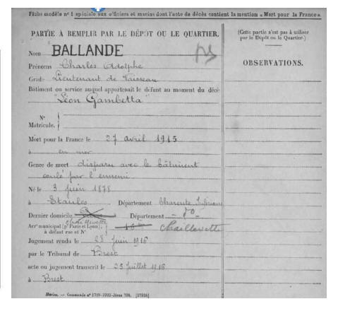 1915, cet Officier sera parmi les victimes du torpillages du