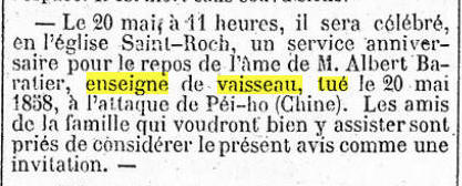 PARIS (Seine) - Tué le 20 mai 1858 à l'attaque des forts de PEÏ-HO,