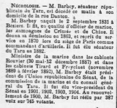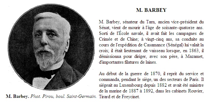 31 mai 1887 (ministère Rouvier), M. Barbey fut appelé à prendre