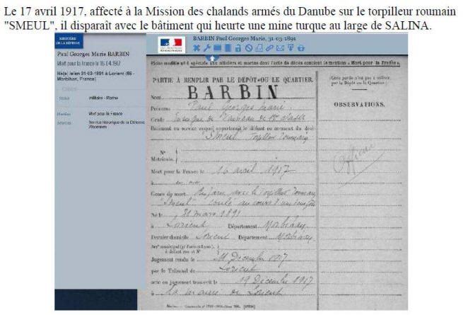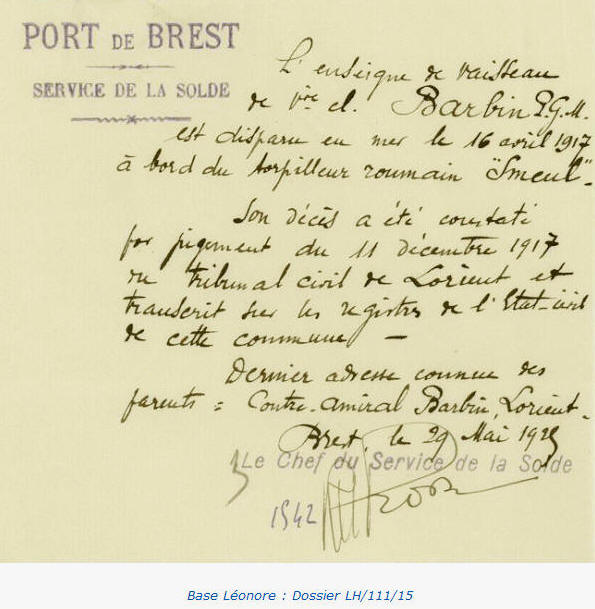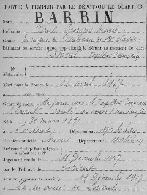 LORIENT (Morbihan) - Décédé le 16 avril 1917 au large de SALINA,