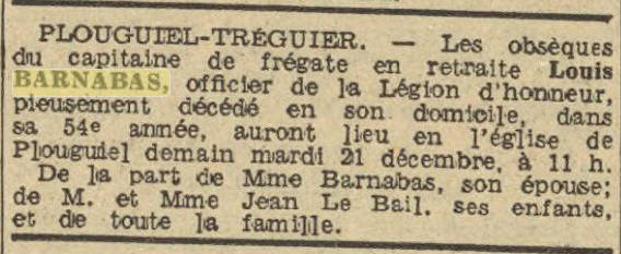 Décédé en décembre 1943 à PLOUGUIEL (Côtes d'Armor)