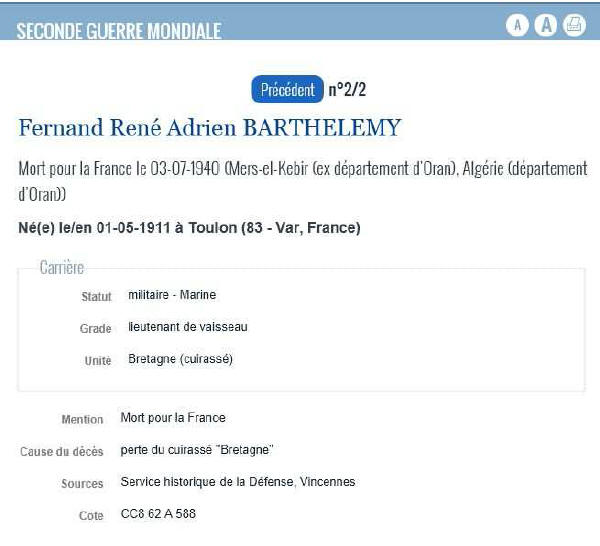 TOULON (Var) - Disparu en mer le 3 juillet 1940 à MERS EL KEBIR